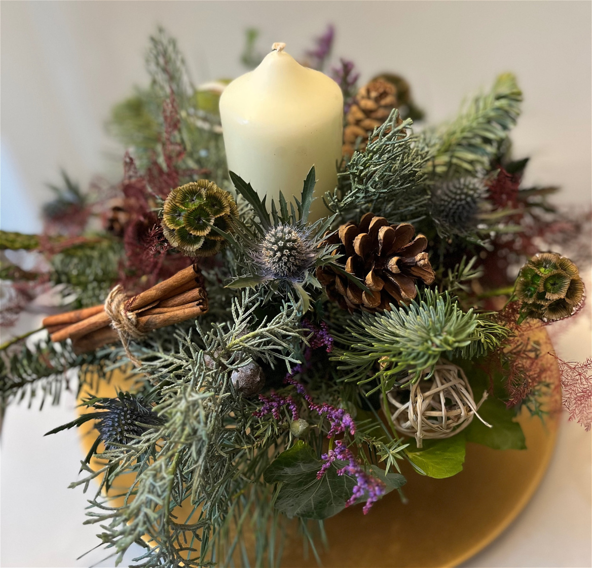 A fresh foliage scented table display, include a candle and Christmas decorations. These are made bespoke to order.